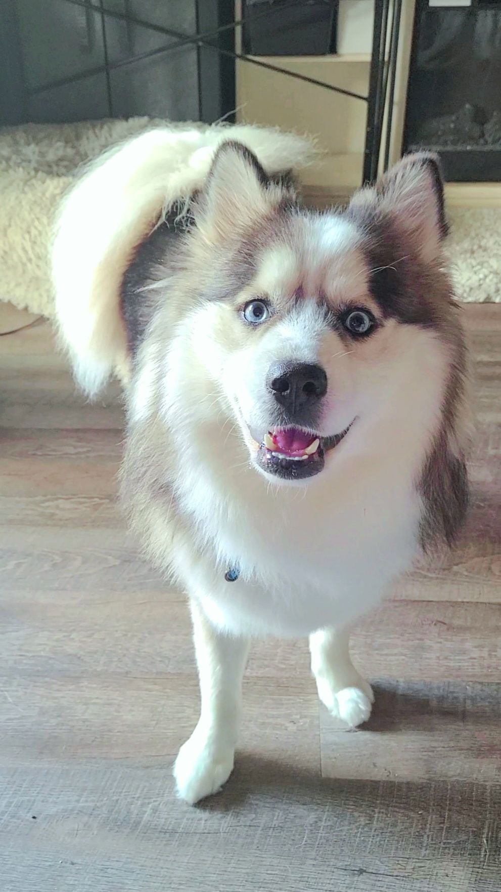 Pomskies can have a standard, thick double (and sometimes triple), or woolly coats. Their ears are upright. They can have various colors/ markings on their fur including the coveted husky type mask, piebold, and merle with various shades of black, gray, browns, and creams. And finally, their eyes range in various colors of browns, ambers, grays, and (my personal favorite) double blue that can mesmerize families for years to come.