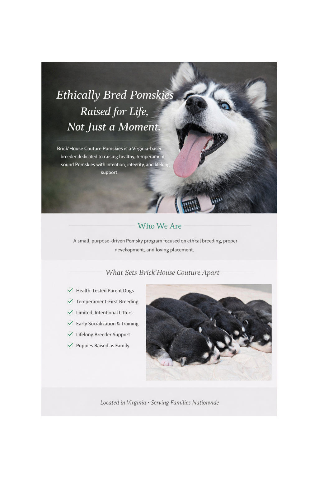 At 'Brick'House Couture Pomskies we will work with you in figuring out if one of our very special dogs is right for you.